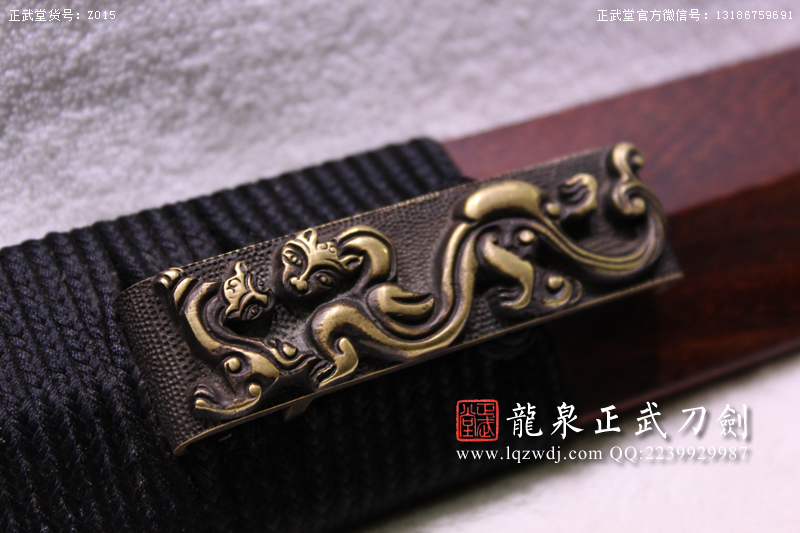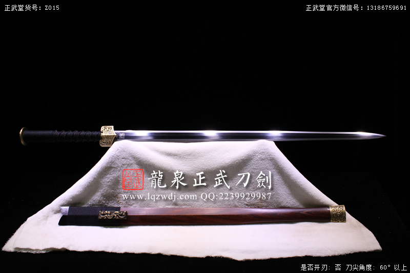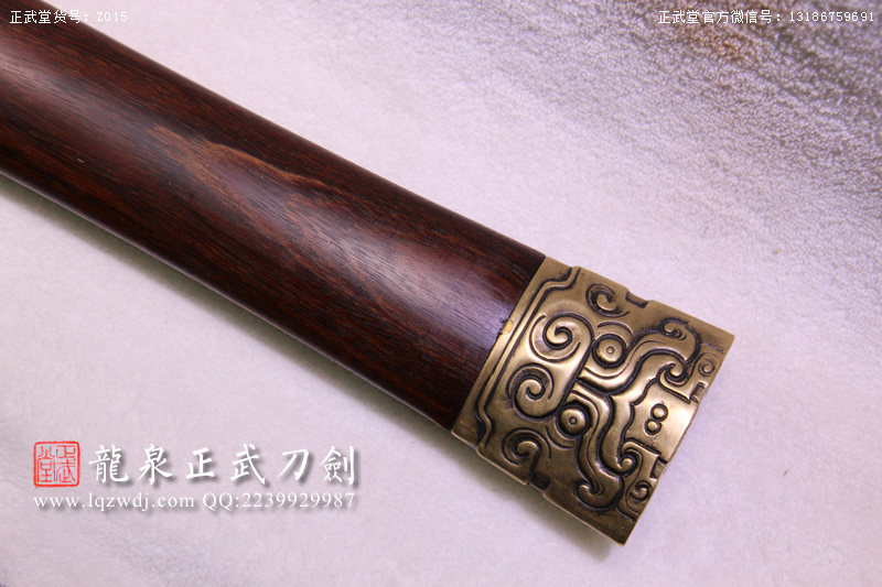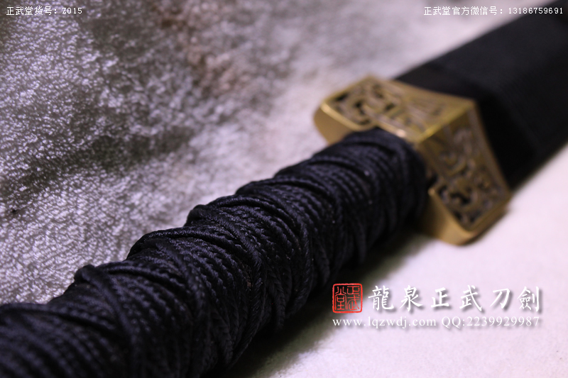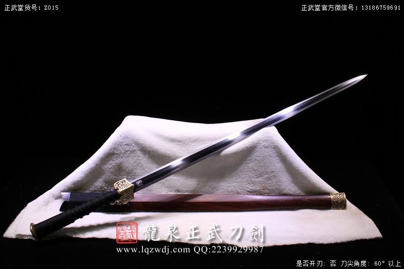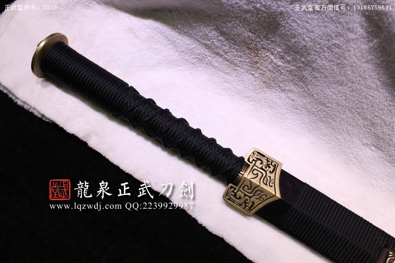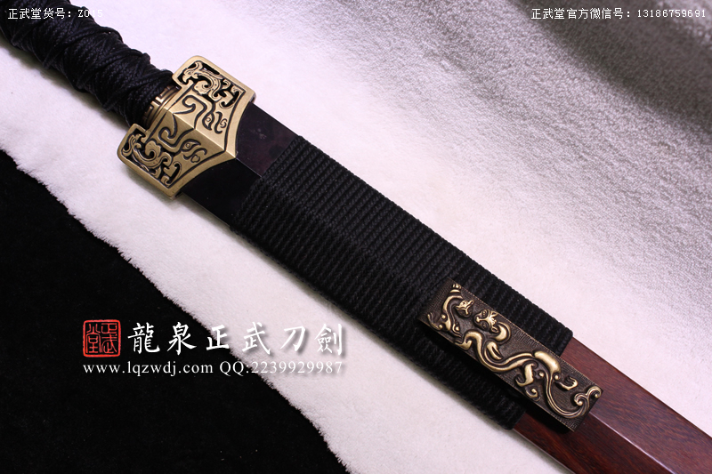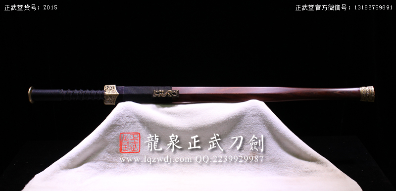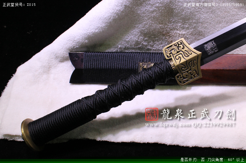 尺寸:全長:109cm,刃長:76.5cm,柄長:24cm,刃寬:3.5cm,刃厚:0.7cm,綁黑色柄繩,蟻木鞘,標(biāo)準(zhǔn)樣式銅裝;