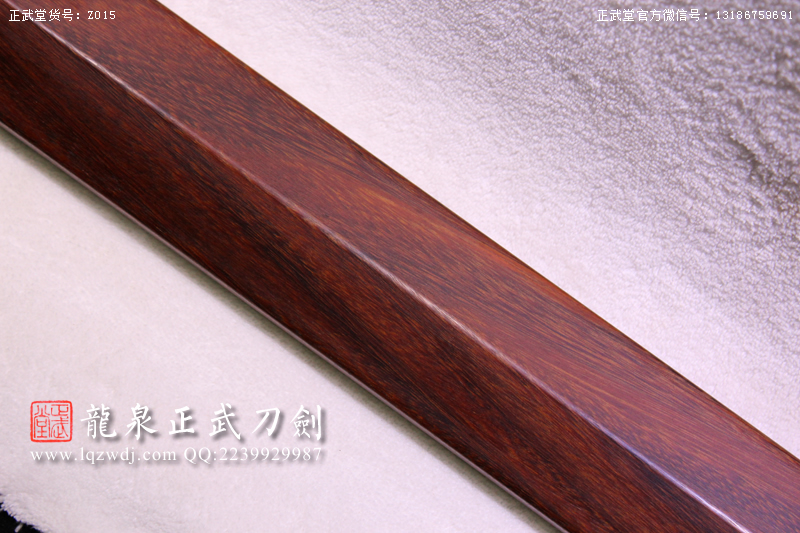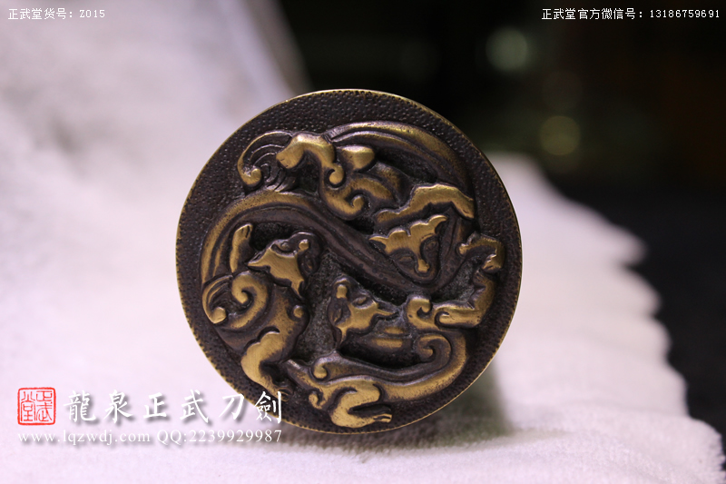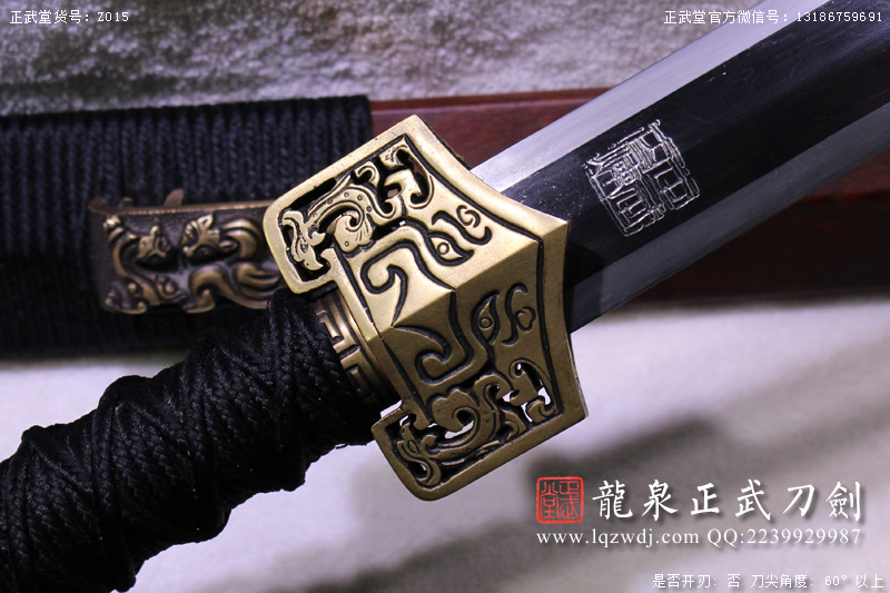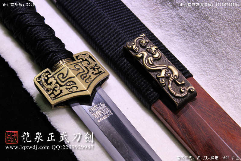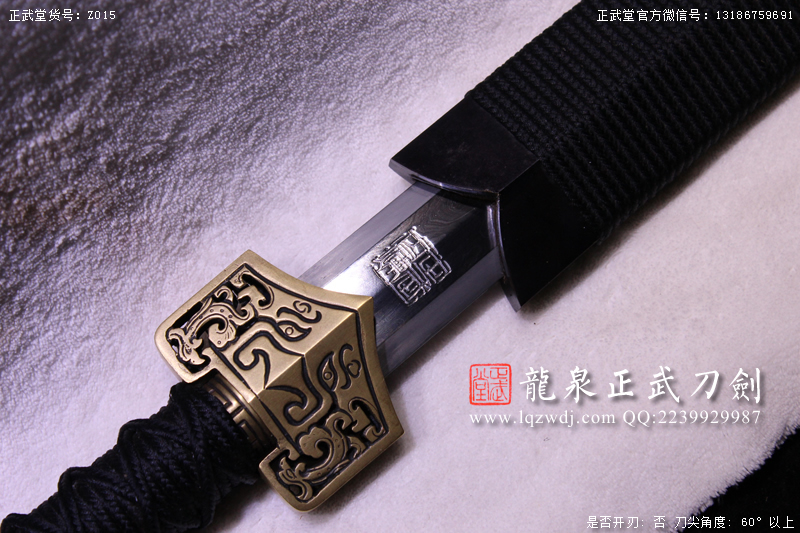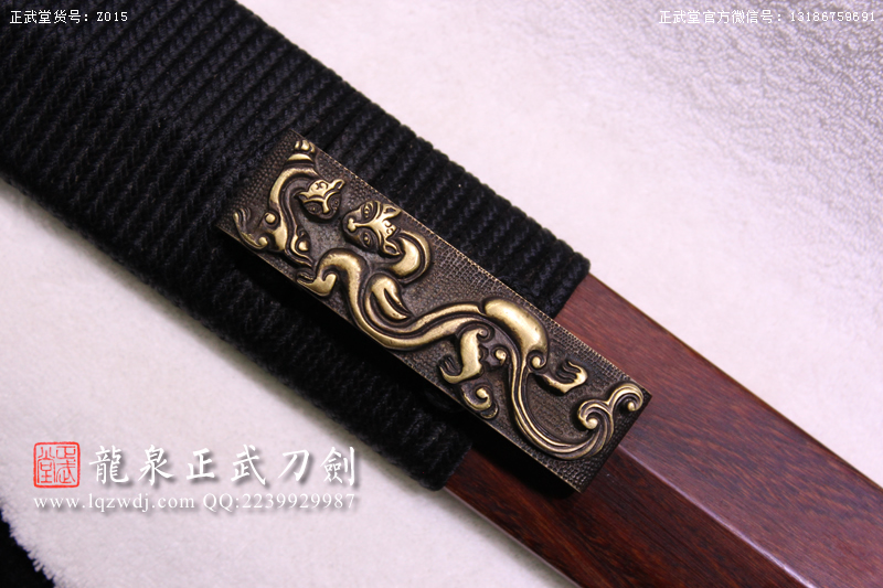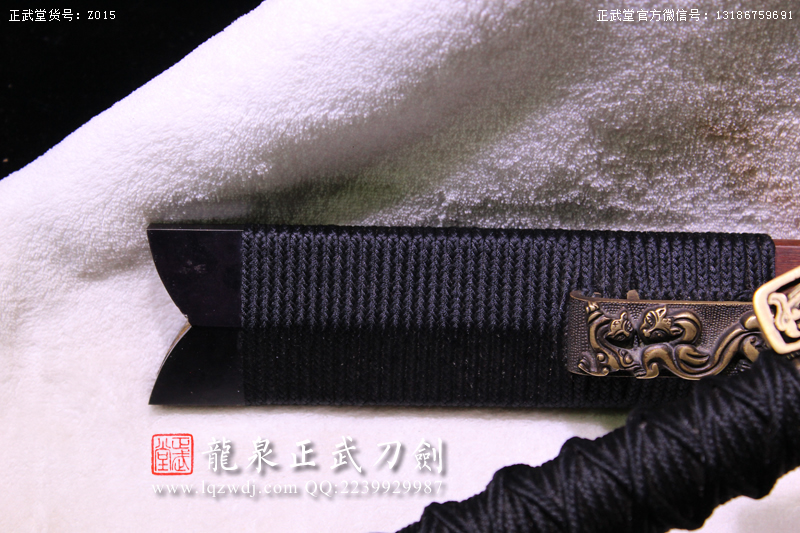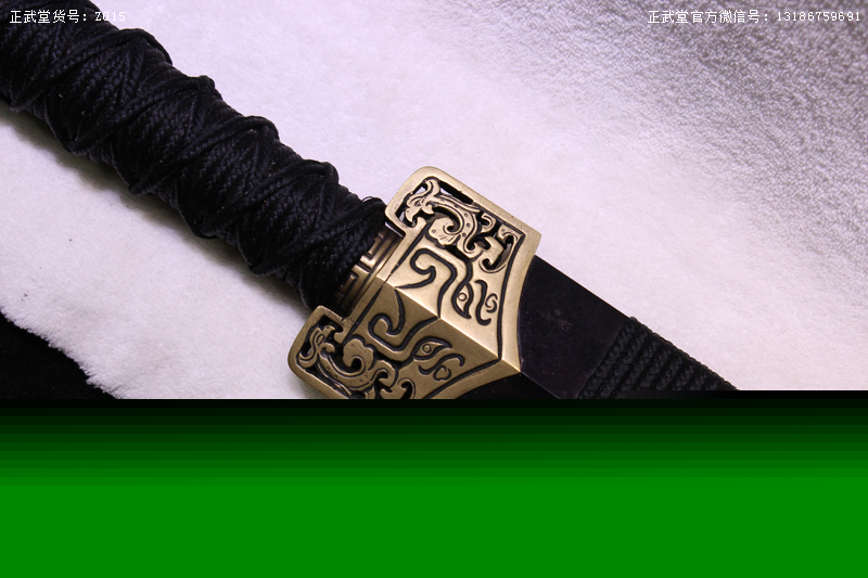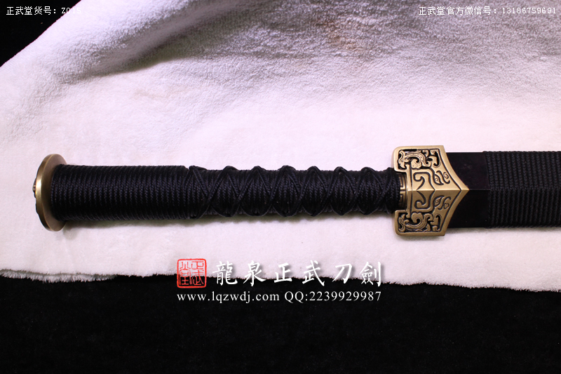 尺寸:全長:109cm,刃長:76.5cm,柄長:24cm,刃寬:3.5cm,刃厚:0.7cm,綁黑色柄繩,蟻木鞘,標(biāo)準(zhǔn)樣式銅裝;