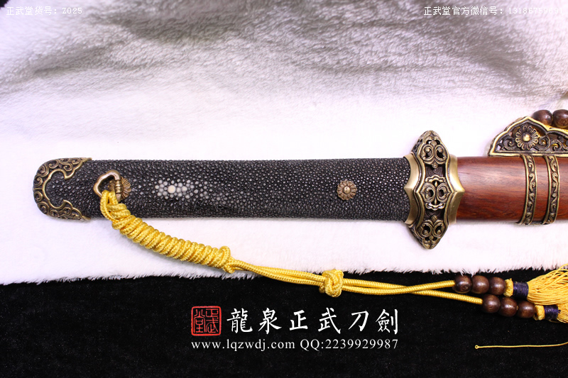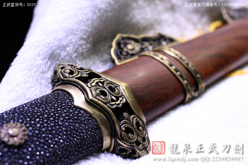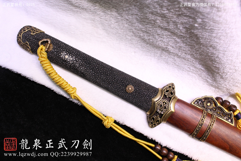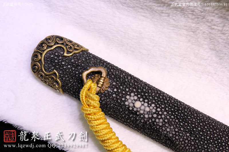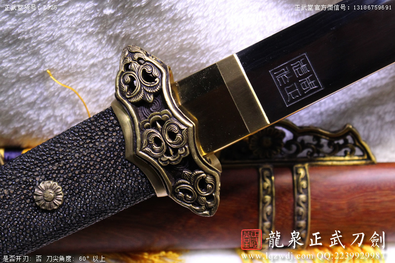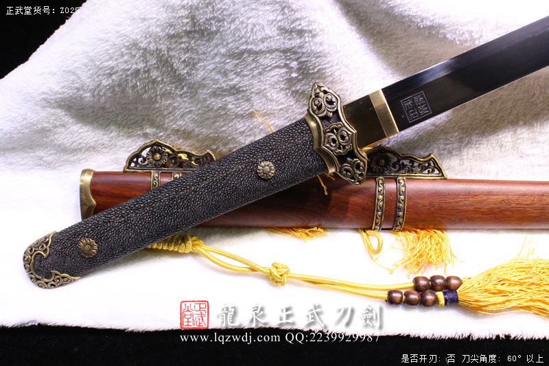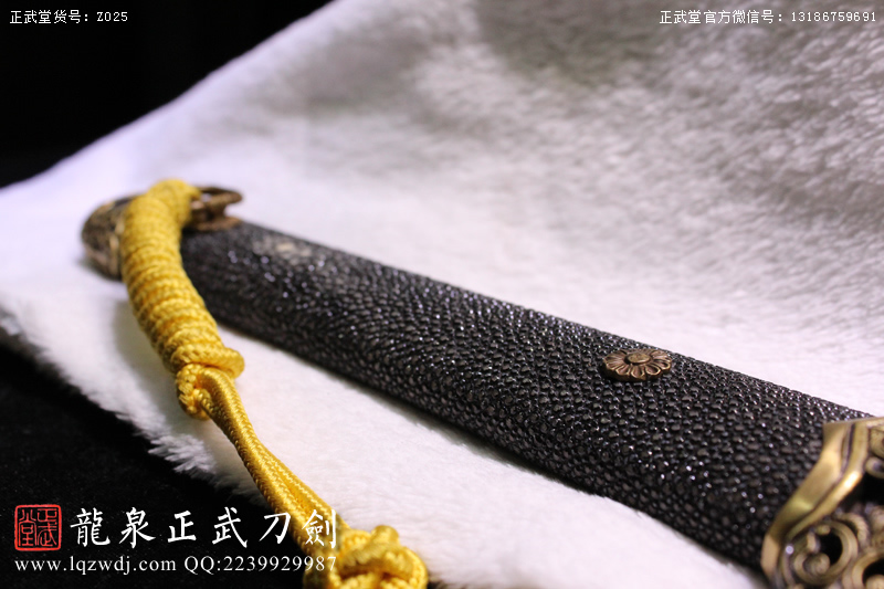 尺寸:全長:88.5;刃長:61.5; 柄長:23; 刃寬:3.2; 刃厚:0.8;鞘長64.3;蟻木鞘;木柄外包黑色魚皮;裝具為銅裝;