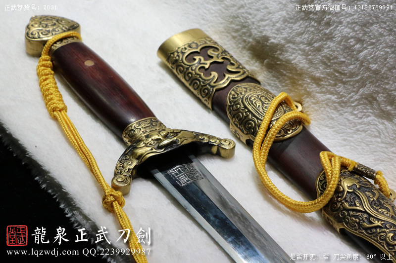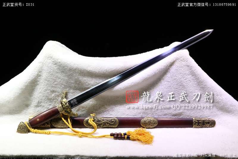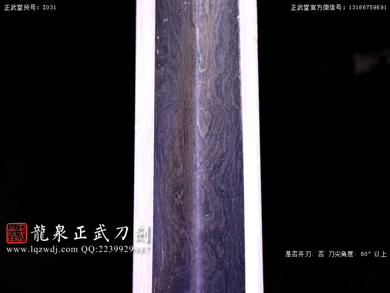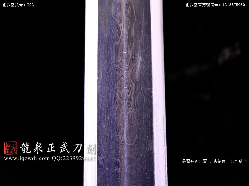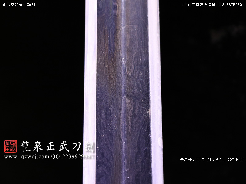 作品鍛造工藝說明:手工折疊鍛打花紋刀劍,折疊鍛打16000余層,夾鋼復(fù)合,刃身采用中等研磨工藝,硬度:58度。