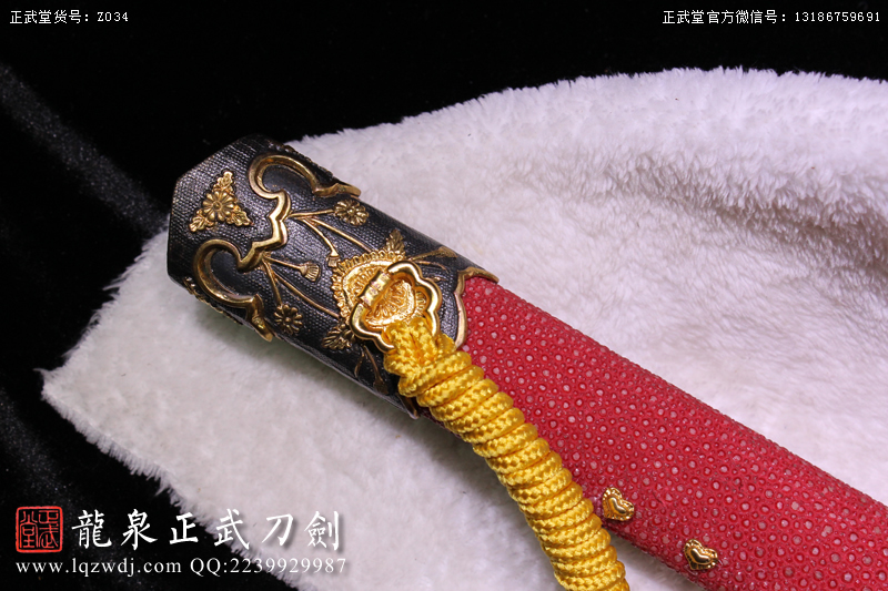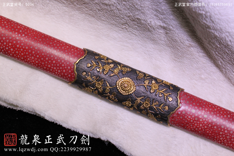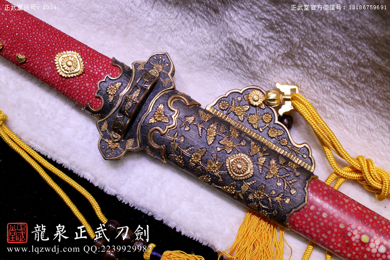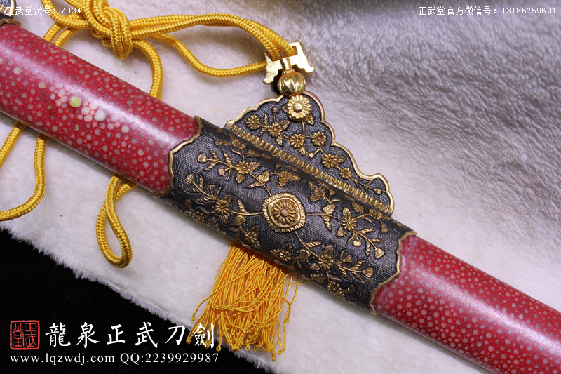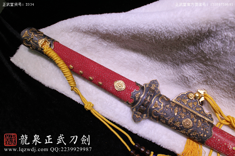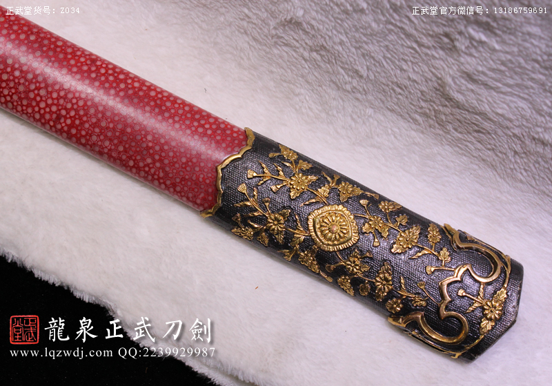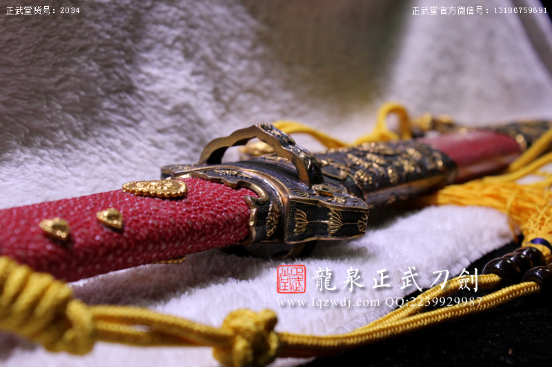 尺寸:全長:107;刃長:77; 柄長:26; 刃寬:3.2; 刃厚:0.8;紅魚皮鞘、柄;裝具為銅裝;