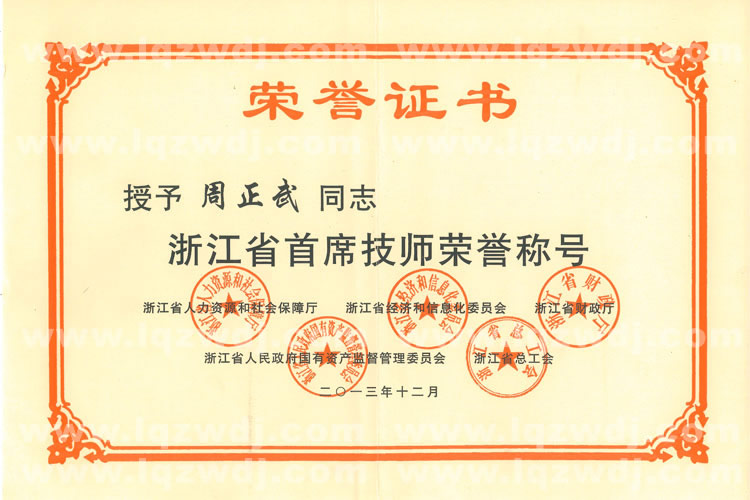 2013年12月份,龍泉正武刀劍有限公司周正武先生被浙江省人力資源和社會(huì)保障廳、浙江省經(jīng)濟(jì)和信息化委員會(huì)、浙江財(cái)政廳、浙江省人民政府國有資產(chǎn)監(jiān)督管理委員會(huì)、浙江省總工會(huì)授予浙江省首席技師榮譽(yù)稱號(hào)。