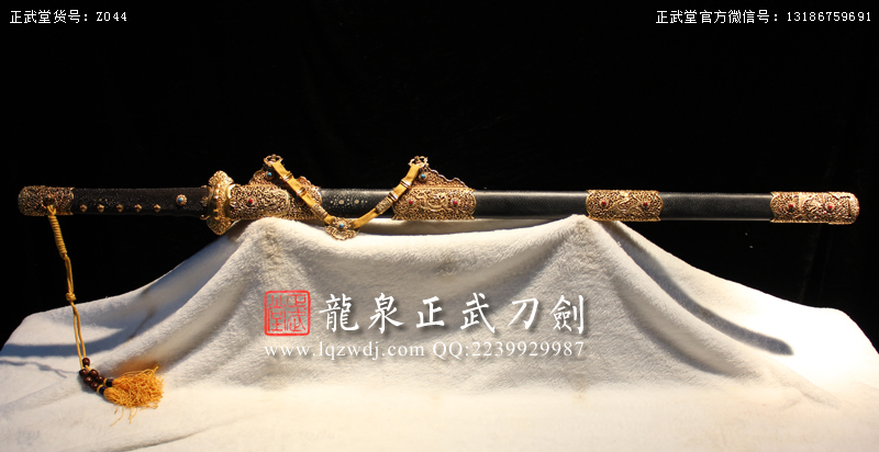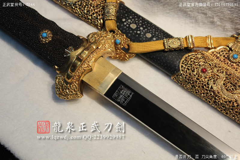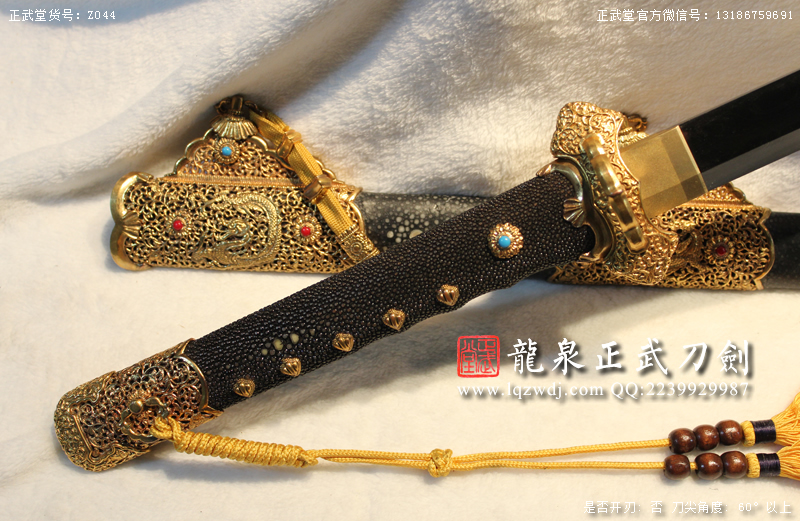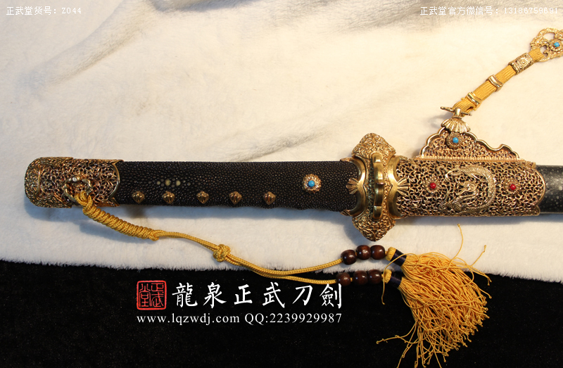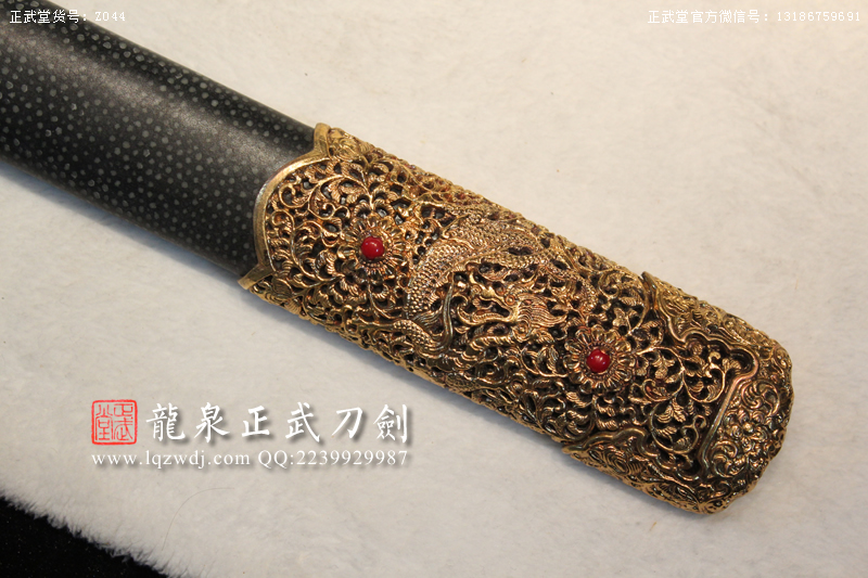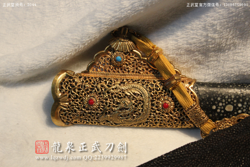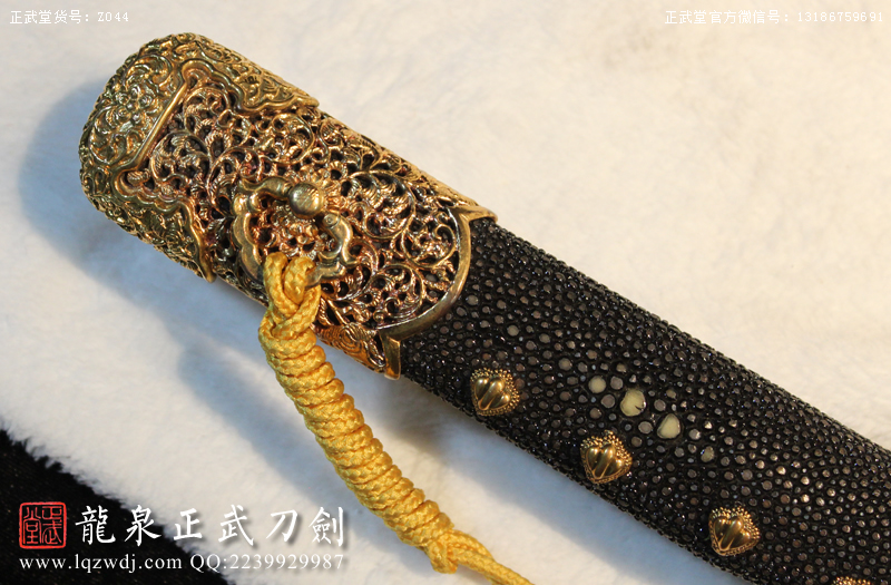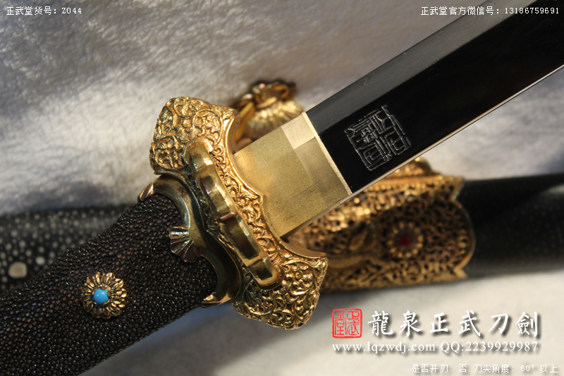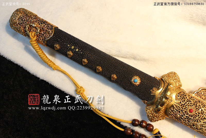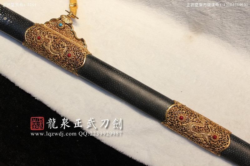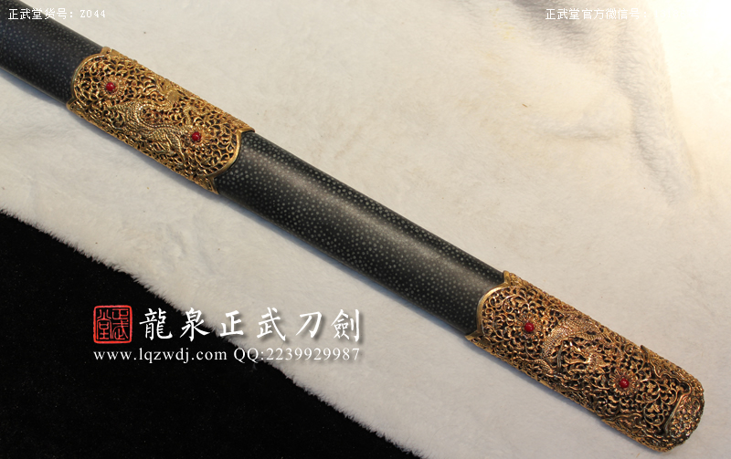 尺寸:全長108;刃長77.6;柄長26;刃寬3.2;刃厚0.8;鞘長81;黑魚皮鞘、柄;裝具為銅裝;