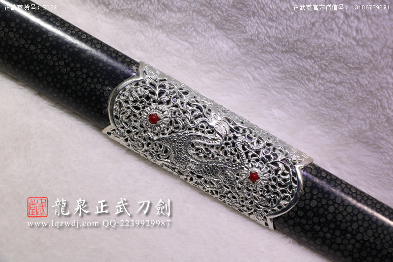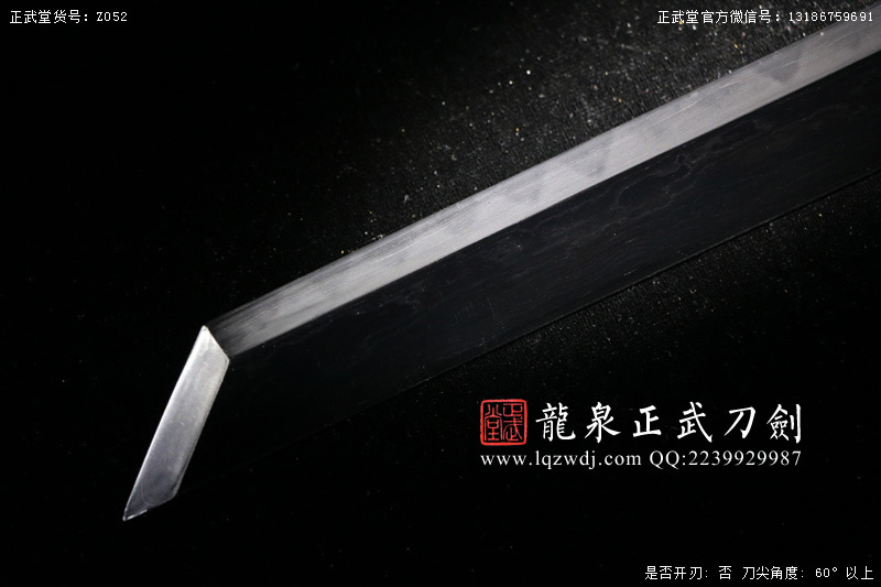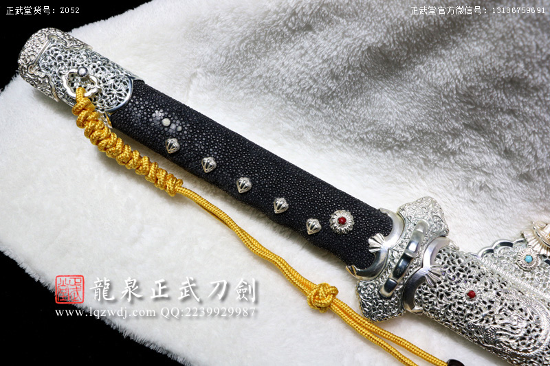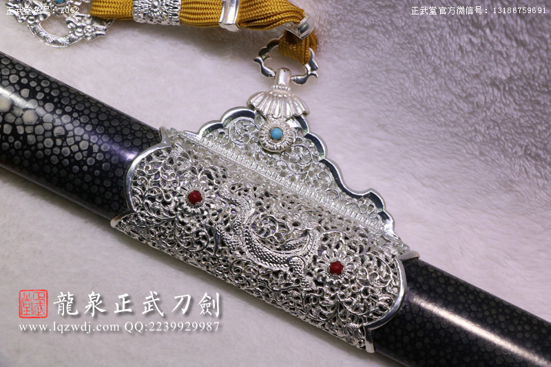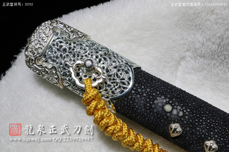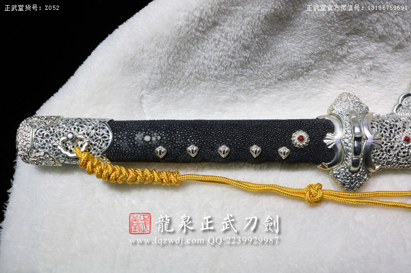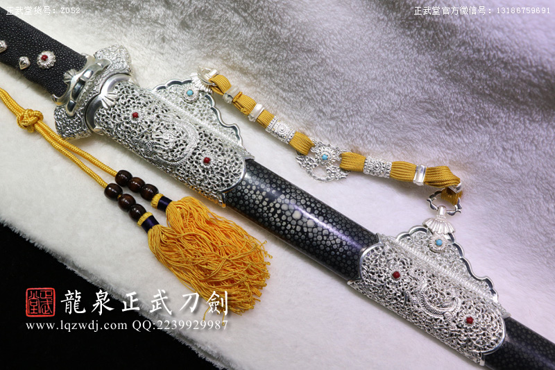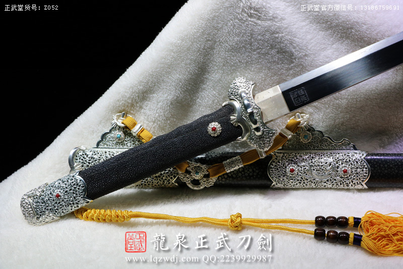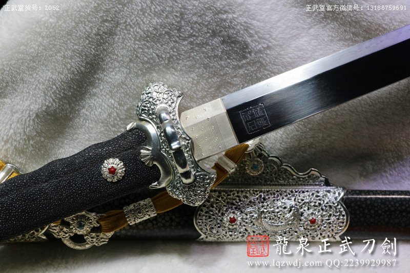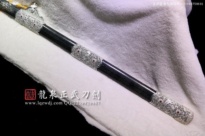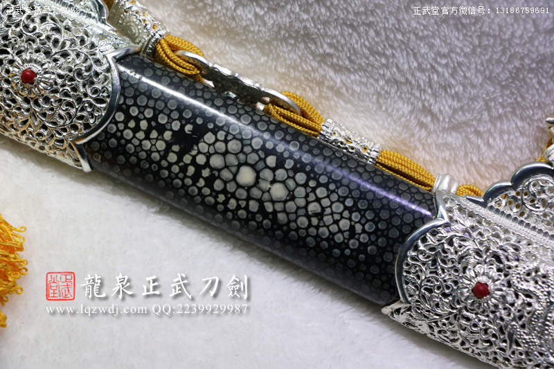 尺寸:全長(zhǎng)108;刃長(zhǎng)77.6;柄長(zhǎng)26;刃寬3.2;刃厚0.8;鞘長(zhǎng)81;黑魚(yú)皮鞘、柄;裝具為銅裝;