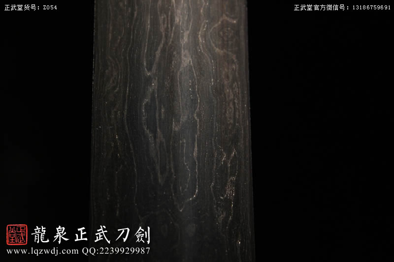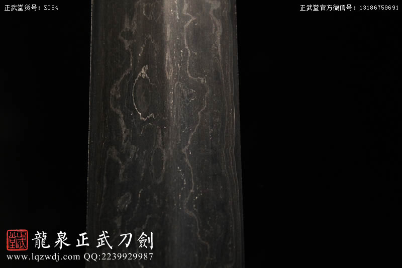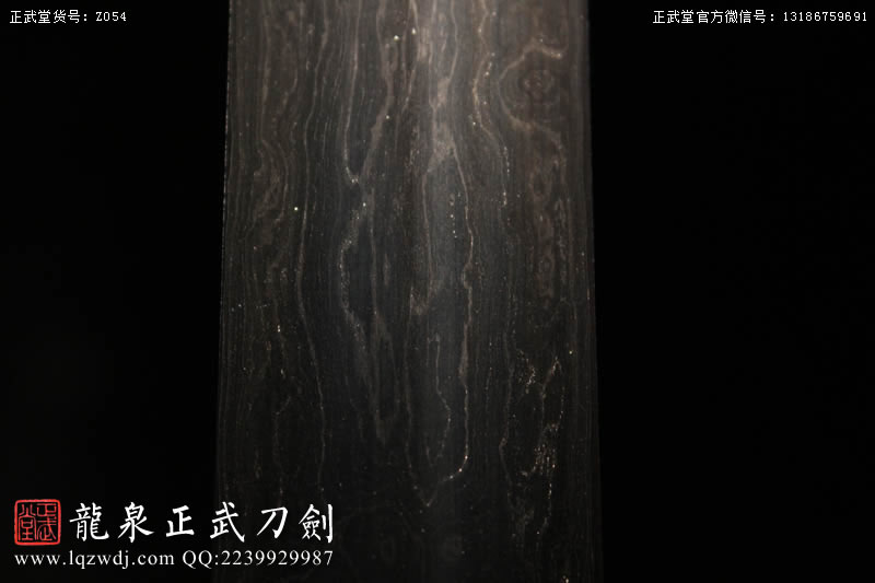 作品鍛造工藝說明:手工折疊鍛打花紋刀劍,折疊鍛打16000余層,夾鋼復(fù)合,刃身采用中等研磨工藝,硬度:58度。