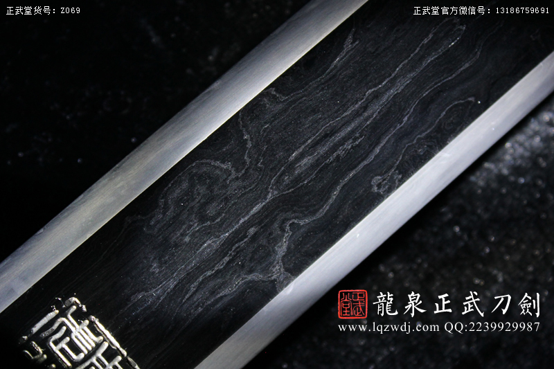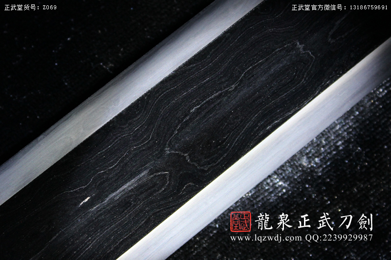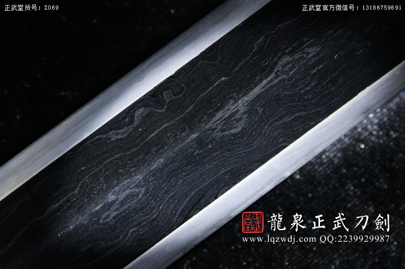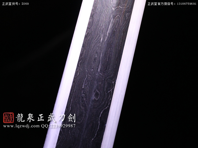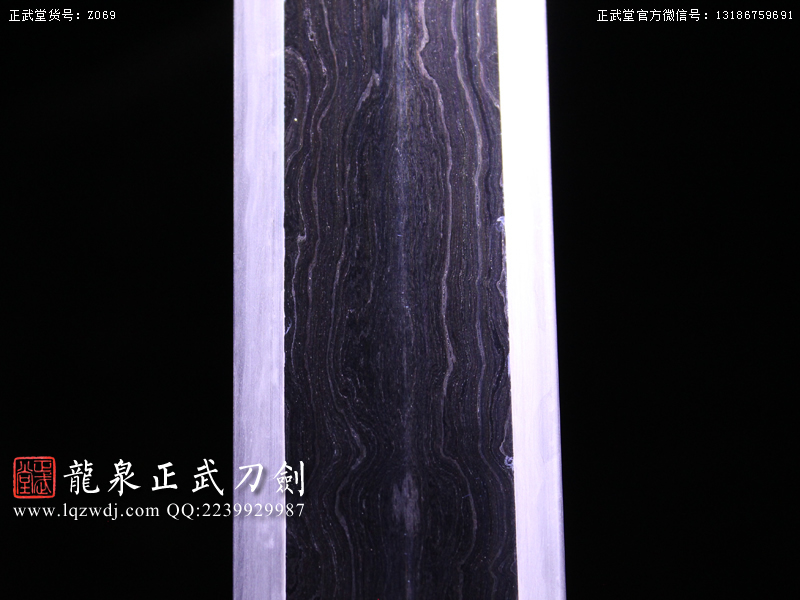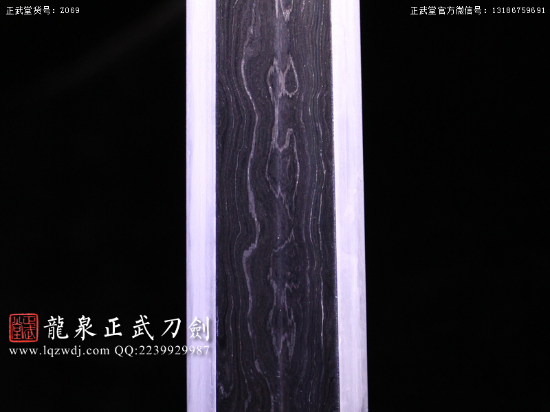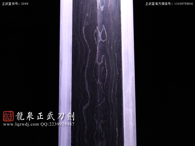作品鍛造工藝說明:手工折疊鍛打花紋刀劍,折疊鍛打16000余層,夾鋼復(fù)合,刃身采用中等研磨工藝,硬度:58度。