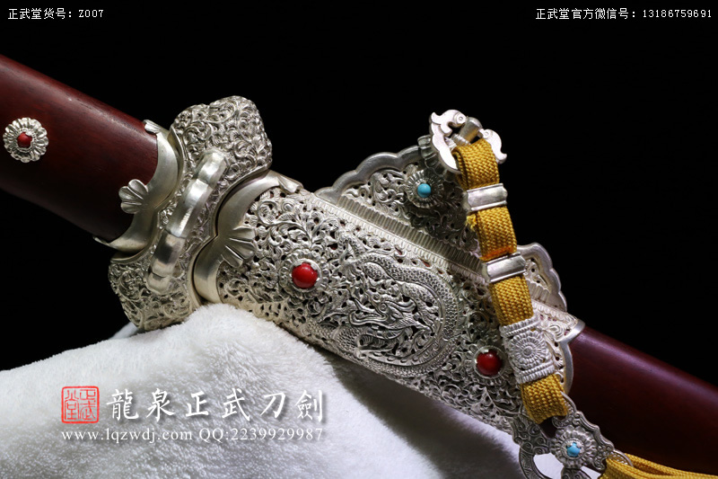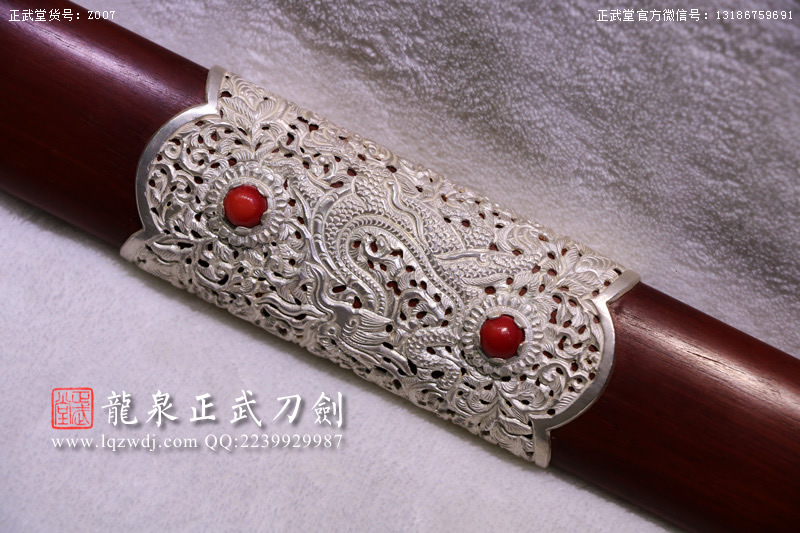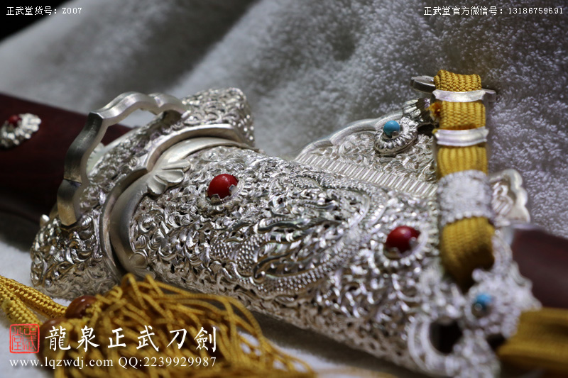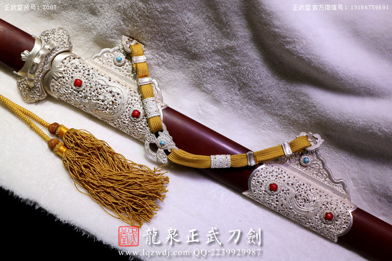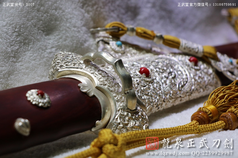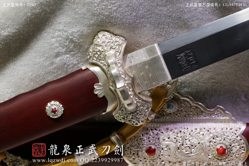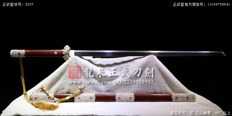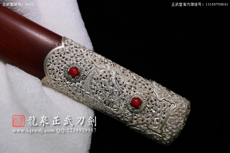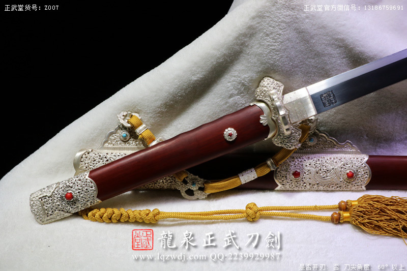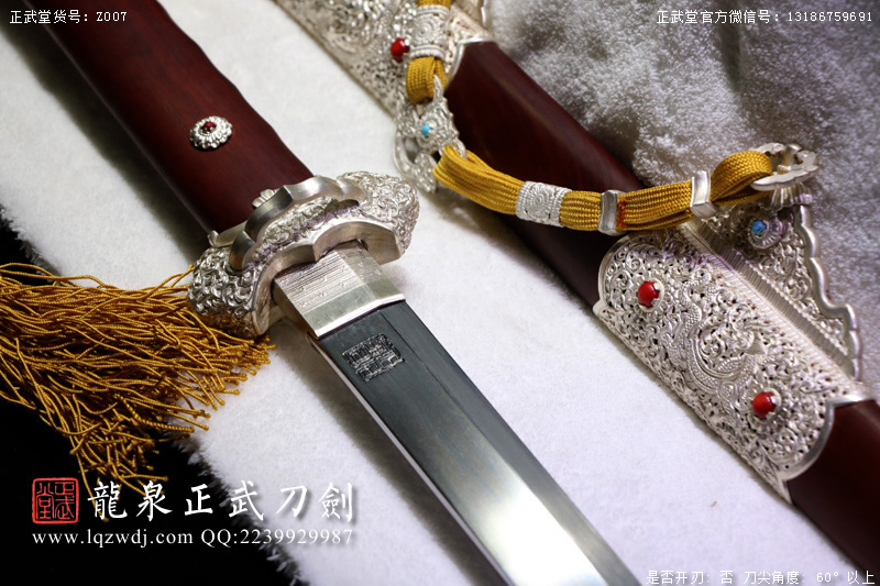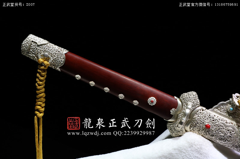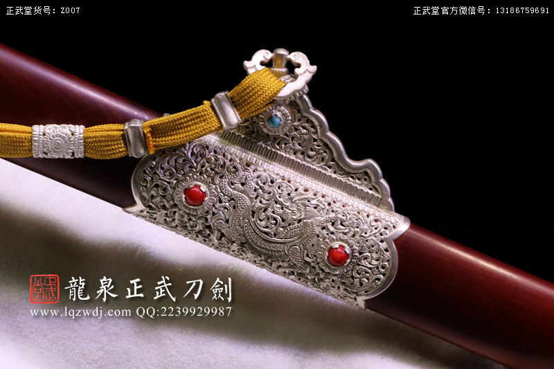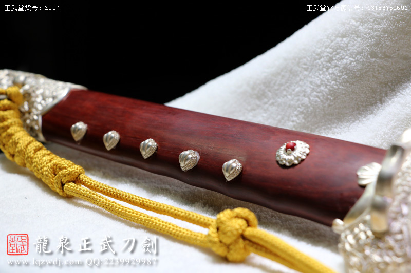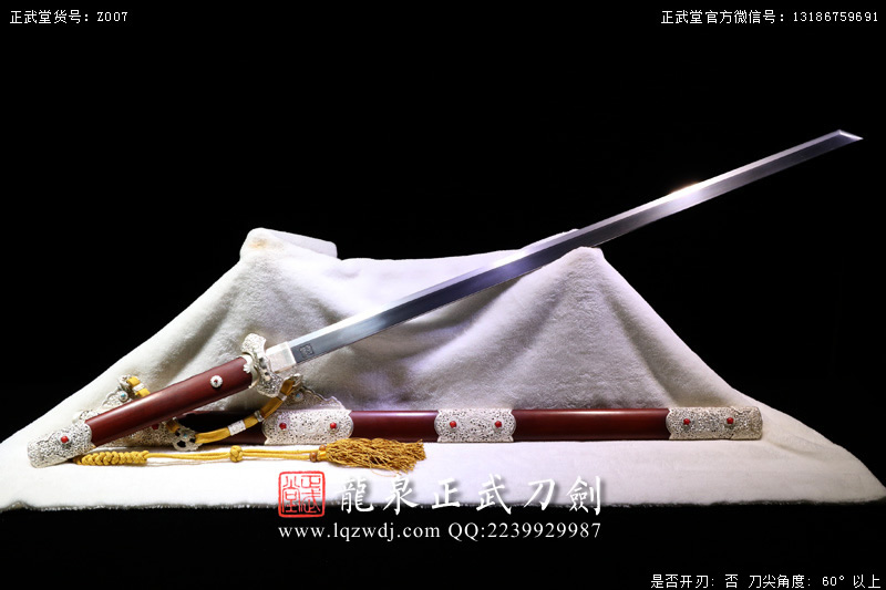 尺寸:全長(zhǎng)108,刃長(zhǎng)77.6,柄長(zhǎng)26,刃寬3.2,刃厚0.8,鞘長(zhǎng)81,紫檀木鞘、柄;裝具為銀裝;
