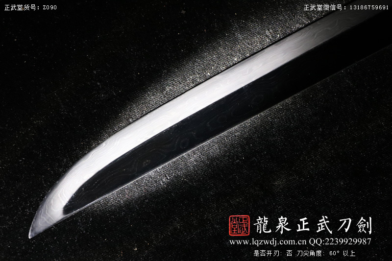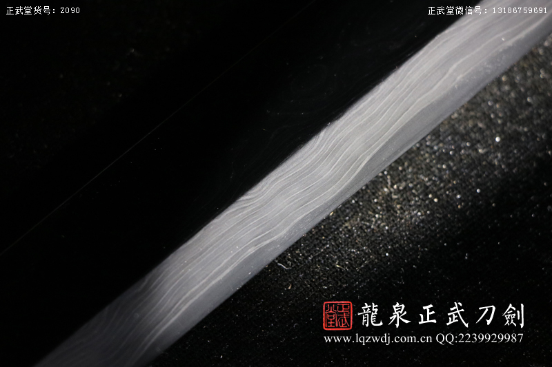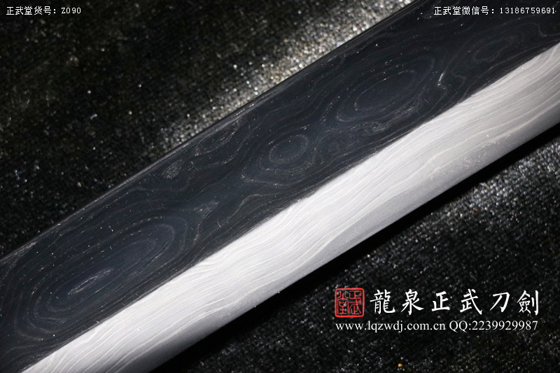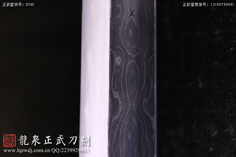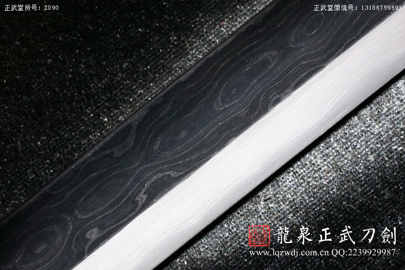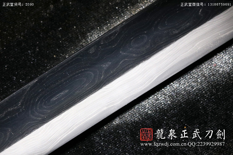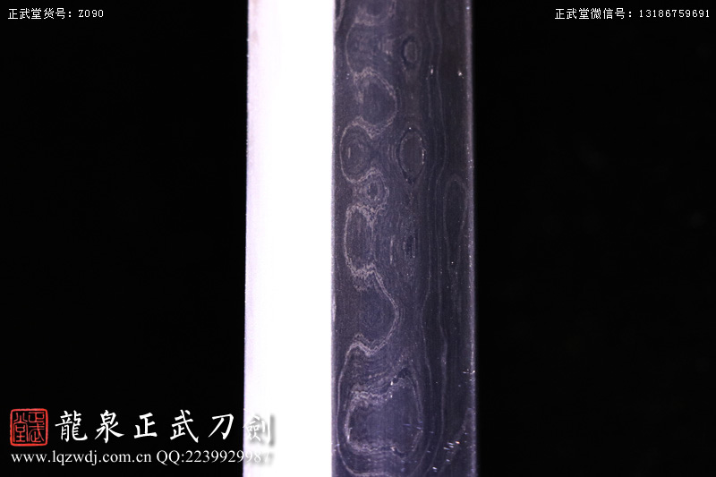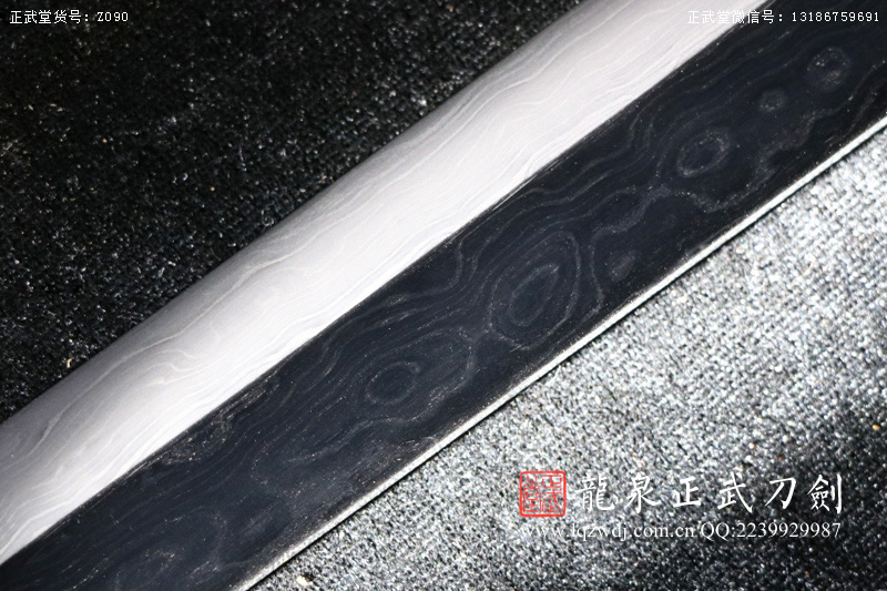 作品鍛造工藝說明:手工折疊鍛打花紋刀劍,折疊鍛打16000余層,夾鋼復(fù)合,刃身采用中等研磨工藝,硬度:58度。