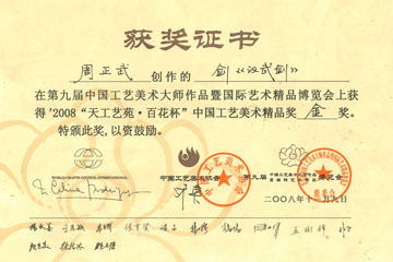 龍泉正武刀劍有限公司周正武漢武劍在第九屆中國工藝美術(shù)大師作品暨國際藝術(shù)精品博覽會上獲得2008“天工藝苑.百花杯”中國工藝美術(shù)精品獎金獎。