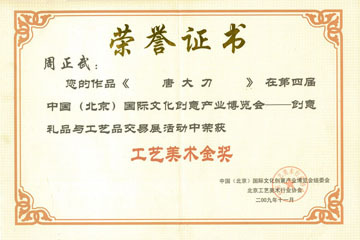龍泉正武刀劍有限公司周正武唐大刀在第四屆中國(北京)國際文化創(chuàng)意產(chǎn)業(yè)博覽會-創(chuàng)意禮品與工藝品交易展活動中獲工藝美術(shù)金獎。