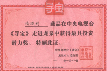 龍泉正武堂刀劍鑄劍師周正武于2011年11月16日藏品《漢鐵劍》在中央視臺《尋寶》走進龍泉中獲得最具投資潛力獎。此次評然由中央電視臺《尋寶》和龍泉市人民政府共同組織。